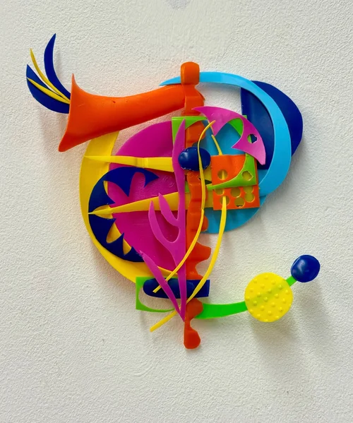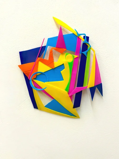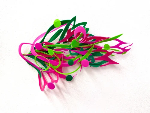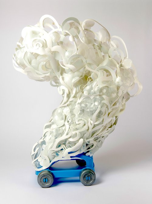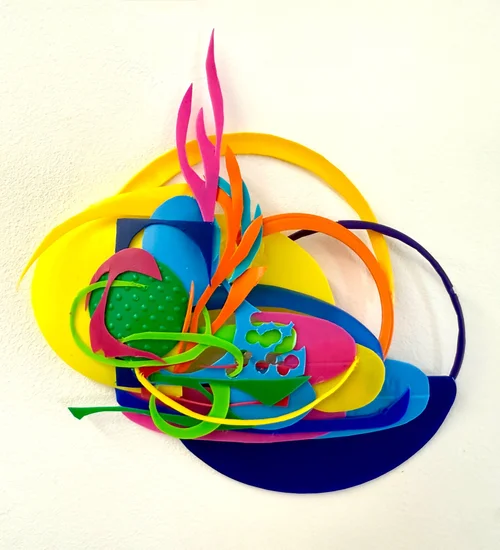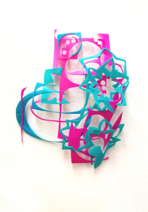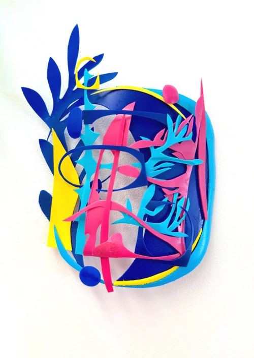 Wall based sculpture from hand cut and waste HDPE plastic, Milliput, UV protective varnish.