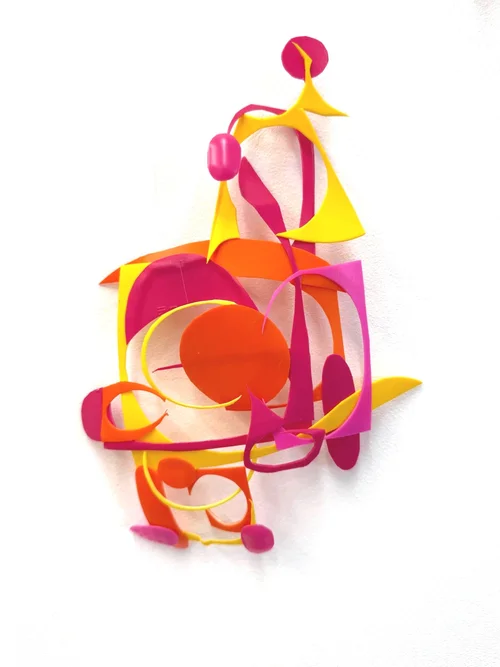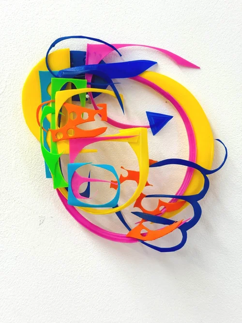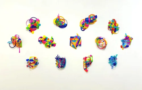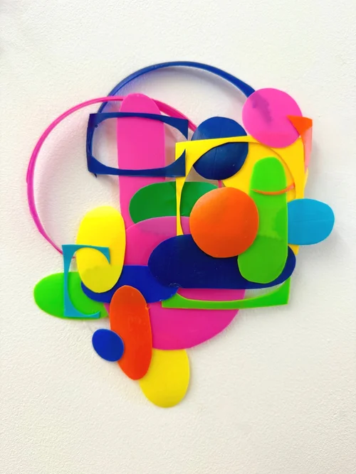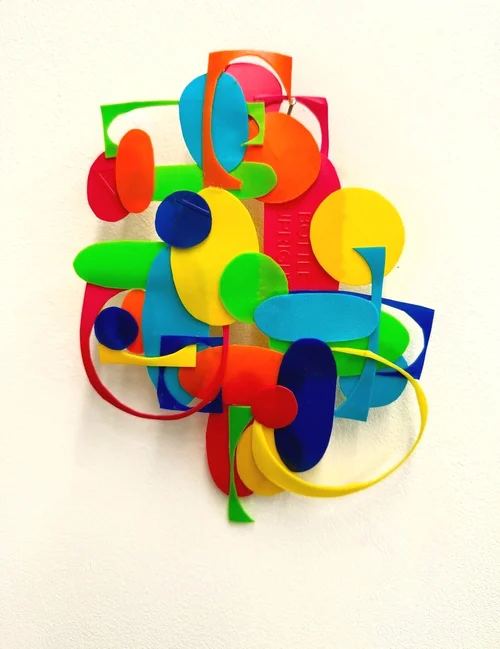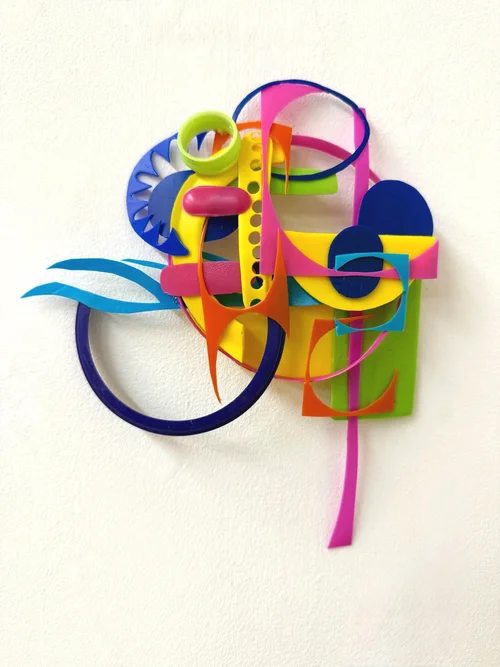 Hand - cut repurposed waste plastic, glass, wood, paint.