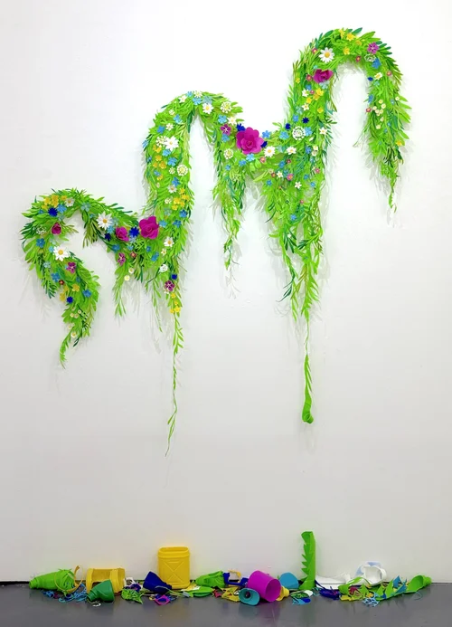 Making vibrant, sculptural works using waste plastic, recycled paper and metal, Beaumont transforms her chosen materials into artefacts that reflect on environmental, political and personal concerns. Often drawing on the ornate traditions of baroque and rococo design, her work reimagines excess as a metaphor highlighting the tensions between nature and consumption and subverts convention. Through considered presentation she invites viewers to contemplate what is valued and what we leave behind. Click on an image below to find out more about each series.